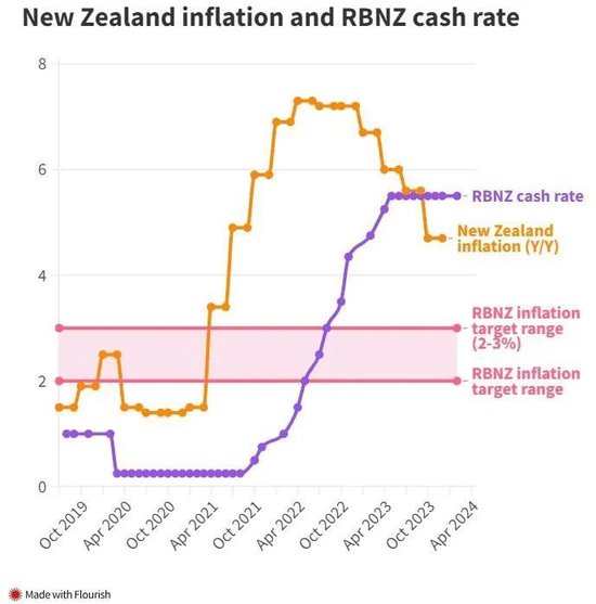 新西兰储备银行在2月份的会议上,将官方现金利率稳定在5.5%,预测到9月,通胀率将重新进入每年1%至3%的目标区间。