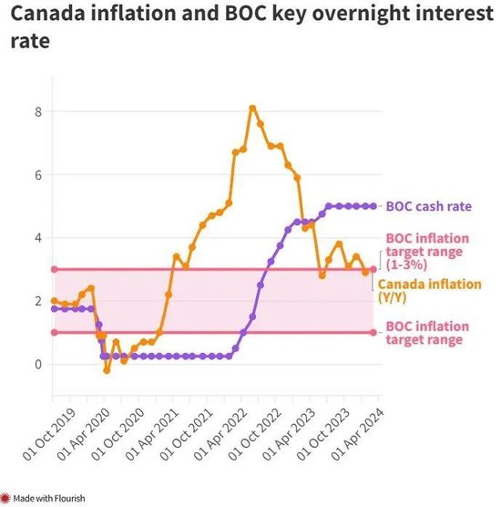 3月,加拿大央行连续第五次会议保持利率不变。其央行行长表示,现在考虑削减还为时过早。与一年前相比,加拿大1月份的通货膨胀率降至2.9%。这比去年12月的3.4%有所下降,在中行1%至3%的目标范围内。