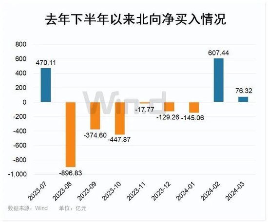 具体按月来看,今年1月份北向净流出145.06亿元,连续6个月净卖出。随后2月份市场好转,北向资金纷纷转向,当月合计大幅净买入607.44亿,一举逆转持续净流出局面。3月份目前继续净买入,使得两个多月北向净买入全面超过去年全年。