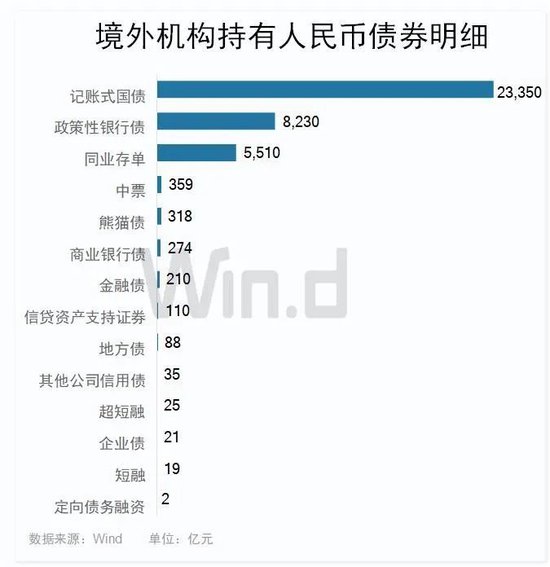 从最新外资机构持券结构来看,境外机构最新持有记账式国债规模最大为23349.66亿元。紧随其后政策性银行债、同业存单也备受追捧,持有规模超过5000亿。其余各类人民币债券持有规模都较小,但种类不少,均在500亿元以下。