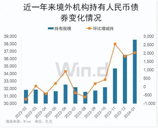 除了A股,境外机构持续增持人民币债券。以中债托管和上清所托管合计来看,Wind数据显示,境外机构最新1月份合计持有人民币债券38550.12亿元,环比较上个月大幅增持2032.92亿元。这也是境外机构连续第5个月增持人民币债券。