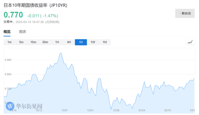 截至发稿,10年期日债收益率为0.77%,3月以来上行约6个基点。