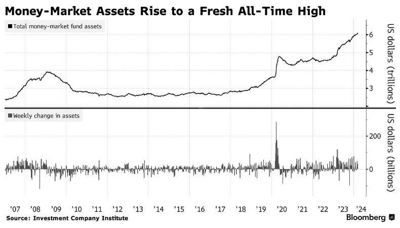 日前,由于交易员收敛了对美联储今年首次降息的押注后,预期短期利率将在更长时间内保持高位,美国货币市场基金资产升至历史新高。