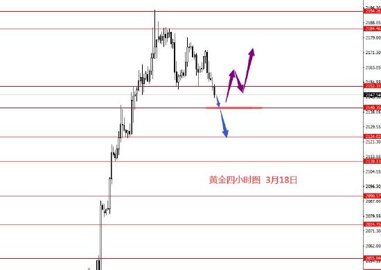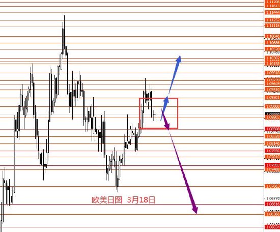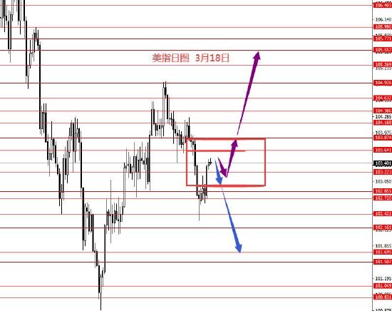 3月18日,美指上周正如预期向上反弹,到达103.40区域。从图形来看,上周反弹后并未回落,上周收盘太高,故本周做两手准备,上方关注103.60和103.80区域强阻力,在下方给出向下信号可做空美指,若向下下跌力度偏小,再留意是否要向上破位,102.90-103.80区间建议灵活操作。上周一的大框架思路还能延用,只是上周还向下概率大些,这周上下概率对半。今日只有框架思路,没有具体操作建议。