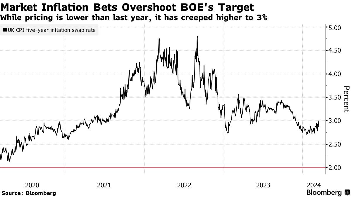 通胀预期高于英国央行的目标可能会让政策制定者保持谨慎。五年期通胀掉期利率(衡量投资者对冲通胀上涨所需的补偿)已攀升至3%,这可能反映了投资者对更少降息的预期。目前,交易员预计英国央行今年只会降息三次左右,而他们在2月时预计英国央行今年会降息六次。