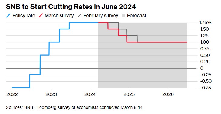 瑞士央行将于3月21日(周四)公布今年的首次利率决议,目前市场普遍预期该行将政策利率维持在1.75%不变。根据Bloomberg对经济学家的调查,瑞士央行将比此前预期更早开始降息。经济学家预计瑞士央行将在6月份首次降息25个基点,9月和12月还将有两次降息,将基准利率降至1%。