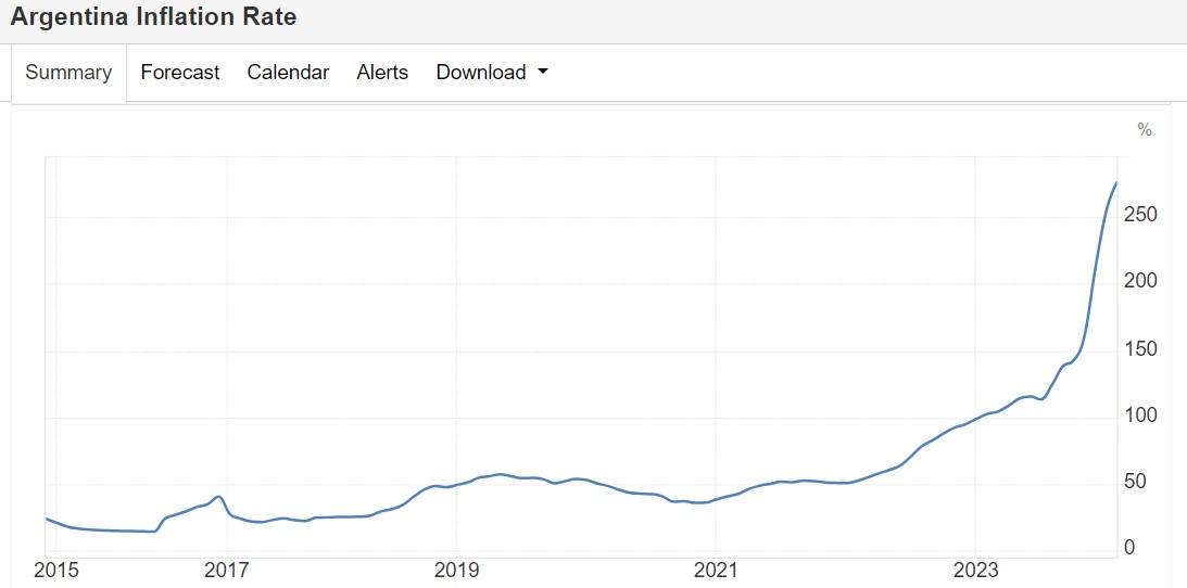 通胀数据显示,阿根廷通胀率从2024年1月的254.20%上升到2月的276.20%。更加可怕的是,从1944年到2024年,阿根廷的平均通货膨胀率高达惊人的189.97%,1990年3月达到20262.80%这一“前无古人后无来者”的历史新高。