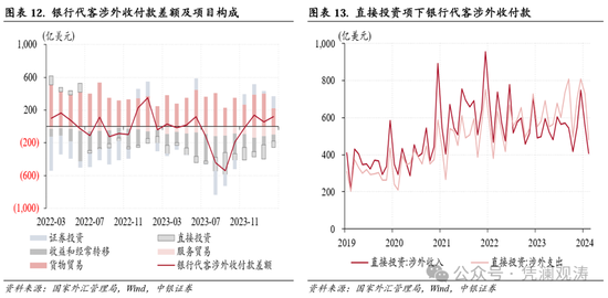 当月,直接投资涉外收付款延续2022年7月以来逆差态势,不过逆差规模由上月171亿收窄至74亿美元,是银行代客涉外收付款顺差增加的第二大贡献项,贡献率为+147%。其中,直接投资涉外收入环比减少151亿至407亿美元,创2021年3月份以来新低;直接投资涉外支出减少248亿至481亿美元,创2022年6月份以来新低,继续证伪外资撤离论(见图表13)。