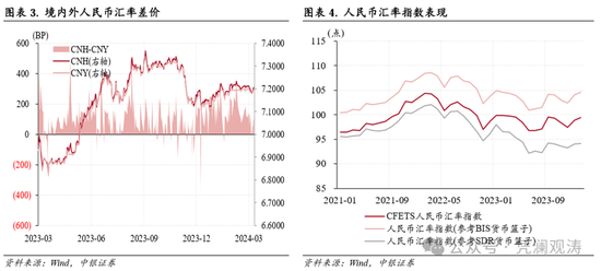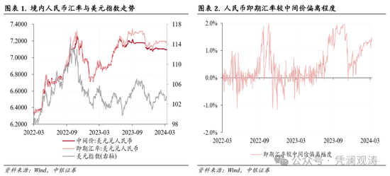 2月份,由于美国就业和通胀数据超出市场预期,导致美联储降息预期明显收敛,推动美债收益率和美元指数震荡上行,10年期美债收益率从上月末4.0%升至4.3%,美元指数最高升至104.9(2月13日),全月累计上涨0.6%。当月,人民币汇率中间价基本稳定在略弱于7.10的水平,全月仅升值3个基点,而即期汇率(境内银行间外汇市场下午四点半交易价,下同)则继续走低,累计下跌0.2%,最低跌至7.1986(见图表1)。