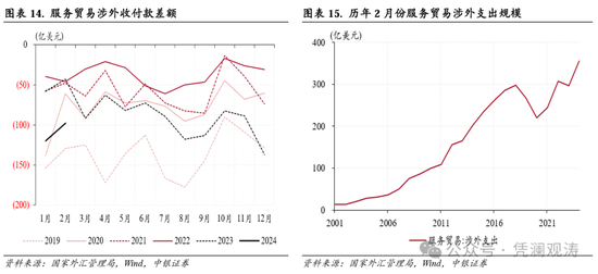 当月,服务贸易涉外收付款逆差由上月120亿收窄至98亿美元,贡献了银行代客涉外收付款顺差增幅的34%,不过仍是2020年以来同期新高,相当于2019年同期逆差规模的76%(见图表14)。其中,服务贸易涉外收入环比减少31亿美元至258亿美元,涉外支出减少53亿美元至356亿美元,后者创历史同期新高,反映居民长假期间跨境出行需求旺盛(见图表15)。同期,货物和服务收支顺差合计126亿美元,同比下降38%,为2021年同期以来新低。
