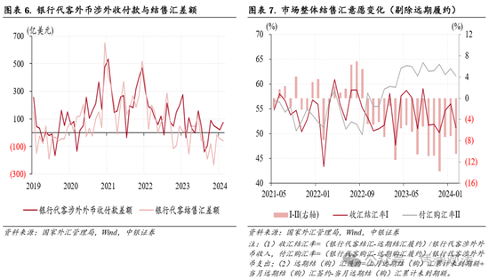 2月份,反映境内银行对客户外汇买卖关系的银行即远期(含期权)结售汇(以下简称银行结售汇)仍然延续2023年7月份以来持续逆差态势,逆差规模由上月200亿收窄至136亿美元(见图表5)。