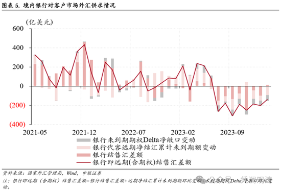 当月,银行自身结售汇由上月逆差55亿转为顺差78亿美元,贡献了银行结售汇逆差降幅的+207%;银行代客结售汇连续8个月逆差,逆差规模由44亿增至61亿美元;远期净结汇累计未到期额环比降幅由上月49亿增至91亿美元,未到期期权Delta敞口净结汇降幅由52亿增至62亿美元,银行外汇衍生品交易合计净卖出外汇153亿美元,上月为101亿美元(见图表5)。