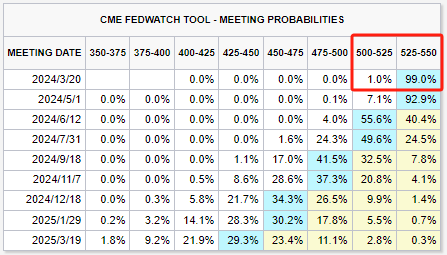 日内,美联储开始召开为期两天的货币政策会议,将于北京时间周四(3月21日)凌晨02:00公布决议。芝商所的“美联储观察”工具显示,市场认为该行“按兵不动”的概率达99%。