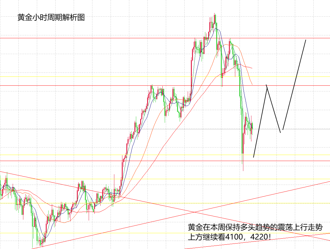 在上周黄金出现极限单边上涨走势中,黄金冲高至4245,不过周五的大跌把多头打的支离破碎,导致又有很多人怀疑暂时黄金是不是多头,今年会不会直接转空,形成大跌,在这里山海还是要强调一下,今年黄金依旧是多头趋势,在市场的基本逻辑不变的情况下,黄金是难以走出大跌空间,难以出现大空头表现得。所以,每一次大跌只能算是较有力度得调整,那么,调整走完又是给我们做多,上车的机会,所以,本周还是维持大趋势多头不变的看法,做低多的交易,是看震荡行情,还是看单边走势需要关注本周非农数据的影响。周初的看法很明确,只要不是破位的单边走势,黄金大概率会在日线周期,H4周期走低位震荡,然后选择方向,日线连阴之下,很难立刻转强,走持续的上涨空间,但一旦走出来,黄金在本周还是可以看到4250或者4300前高,H4周期则是标准的震荡表现,下轨没有开口,上轨的压制在4250附近,所以,暂时有效区间放在布林上下轨之间4050/4250,但上周尾盘下跌空间过大,最低跌至4030,所以,本周还有可能会试探一下前期低点4030,因此,本周有必要先看一下4030/4250区间。交易的话还是等待回落做多。早盘开盘,黄金震荡在4090附近,下方支撑在小周期在4050附近,回落后以此为防守做多,等待周初的上涨空间,上方关注4150得失。