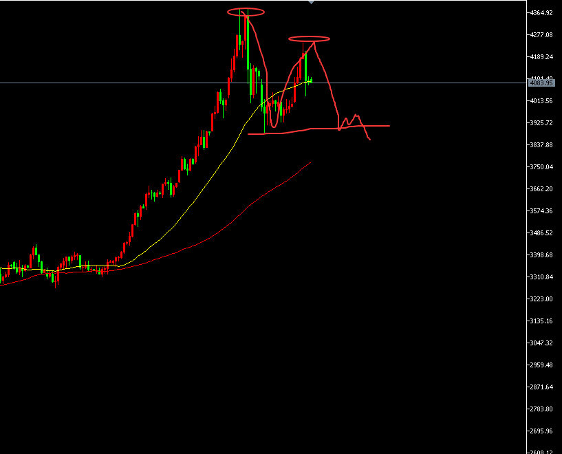 4小时图一波45角度式的慢涨上扬摸高后承压,再以直角形快速下挫回落,此前的上涨一直强调只是二次摸高,并不是强势上涨,针对月线的上影线进行回补,同时也是日线级别的调整B浪高点确认。以4380作为调整浪形开始。4245二次确认形成B浪高点。本周以4245高点作为调整浪形,下方看破3887低点。波段性目标破低后可展望至3600一带,故此前的空单继续持有,本周配合反弹顺势加仓空即可。4小时图日内短线阻力41304150反弹继续空。