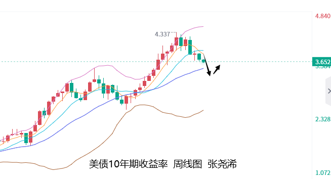 整体看,美元指数存在止跌回升的预期,故此,金价仍有再度回落触及上周低点的风险,不过美元指数周图及其以上周期显示回落的预期和空间仍然较大,美债收益率周图回落的预期也较明显,故此金价在再度回落触及上周低点或下方时,也将是再度看涨的机会。