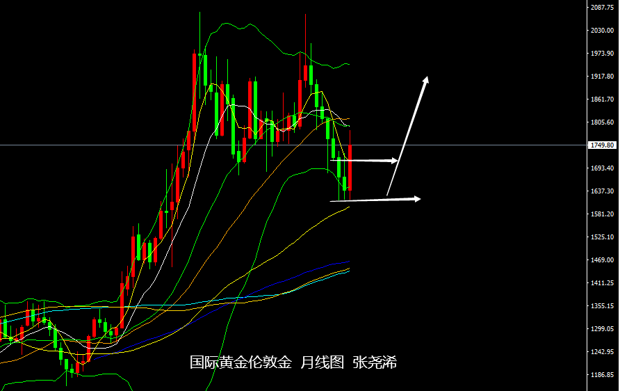 技术上:月图级别,金价本月在大幅走高后,在临近中轨阻力附近有回落行情,不过,目前仍运行在5月均线上方,也将本月还有2个交易日则即将收线,因而走势转向的可能性极小,故此仍然可保持触底回升的观点;