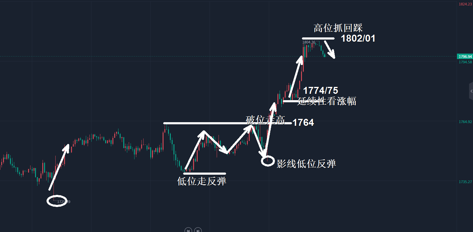 一波反弹冲高,延续性出高点,昨日跟多成功实现获利离场,按照思路走势预期,一旦形成破位走势,那么延续性较强的预期是大概率事件,所以昨日跟多是主要参与思路,后市回踩力度较小,给出临盘1774附近多单,后市上行至1790一线附近离场,后市二次延续性走高至1800上方,最终在1800上方整数关口停滞,这是昨日的整体波动。