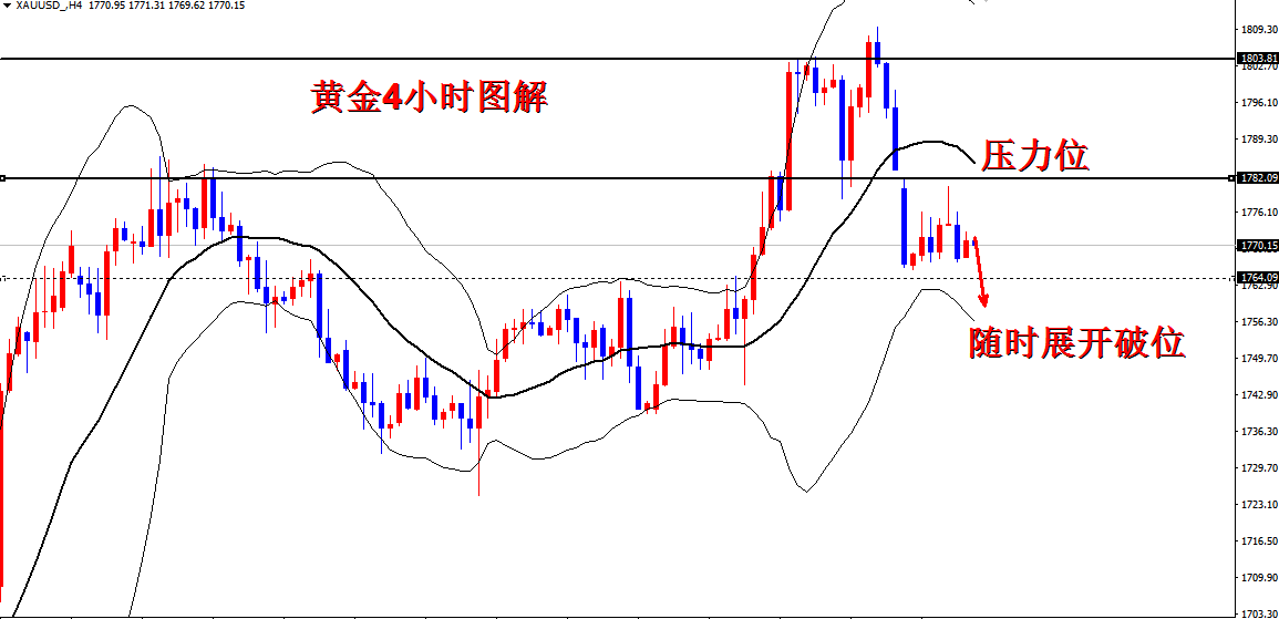 金价4小时收墓碑线,验证了1780一线的压力位,同时也在4小时中轨下方,排除上涨的可能,暴跌随之而来。