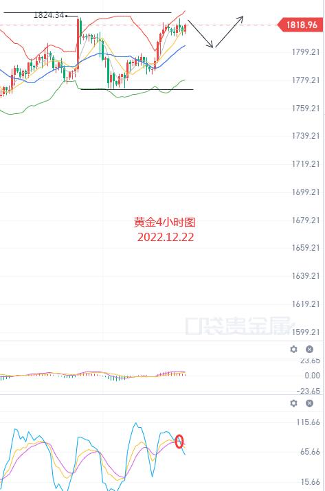 黄金昨日如期小幅回调后上行价格再次到达第二压力位1824一线,日线收小阴,今日若按昨日所说那么今日收大阴的可能性较大,或会先刷新高再回落,或直接回落,若行情继续刷新却不回落,那么后续或将成功站稳于1800关口上方运行,且价格将维持长线趋势下行通道中的波浪上行模式,那么今日继续关注破位收线情况。4小时图中来看布林带大开口向上运行,KDJ指标形成死叉,日内先关注回调情况,下方关注1805/1797/1773一线,上方关注1824/1848一线压力情况,本周大区间关注1783-1858.