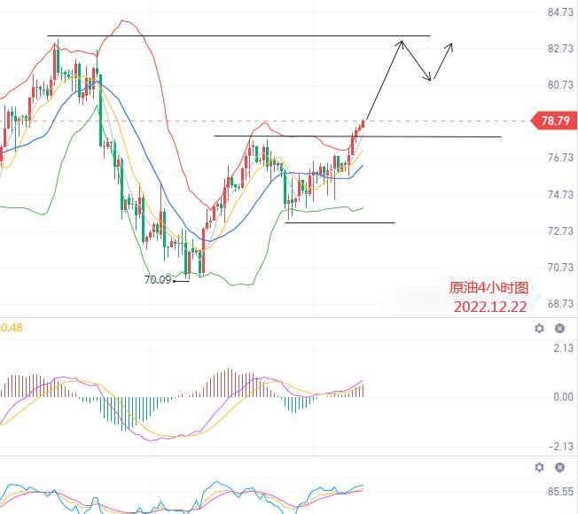 原油昨日如期反弹,日线收了一根中阳柱,目前日线图中来看布林带即将开口,KDJ和MACD指标皆金叉放量,价格还有上行需求,今日维持涨势继续向上延伸,目前价格最高到达78.8一线。4小时图中布林带大开口向上运行,目前来看价格依旧震荡偏上运行。小时图中来看布林带大开口向上运行,价格仍处于上行通道中,但KDJ指标处于超买区,继续等待其形成死叉,今日先关注上行情况,等待KDJ指标形成死叉后开始回调,日内上方关注79.6/81.8/82.2,下方关注77.8/75.9/74.8,本周大区间关注83.3-73.1之间.