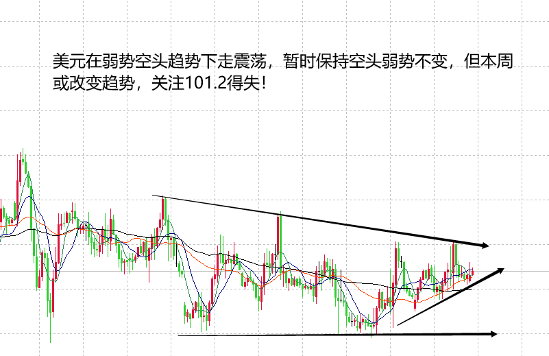 美元依旧在空头趋势下走低位震荡,保持在101.8附近不变,本周的重点不是看技术面表现,而是关注市场变化,市场重点在美联储利率决议和2月非农数据上,周评讲过,此次机会将改变美元,黄金市场暂时的焦虑,美元可形成上涨至102.5,105,或者更高的空间。周初还是空头趋势,看技术面表现,周线在底部收小阳,日线在底部连阳,暂时有可能形成底部形态,等待日线收大阳,再看大涨空间。