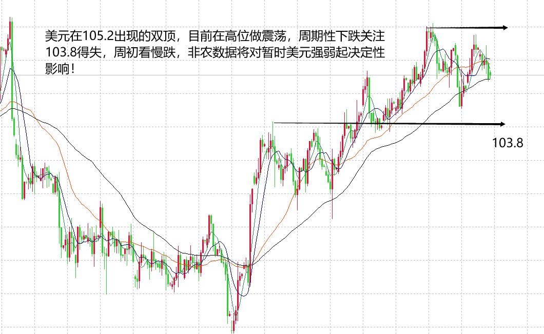 美元在上周震荡慢涨走高,两次触及105.2后见顶,暂时可以确定美元在105.2附近形成技术面双顶,短期内要涨上去会很难,市场也缺少上涨的动力,本周迎来数据周,将对美元有较大影响,预计会挣脱暂时的区间。排除数据来看,本周美元暂时保持在105.2/103.8区间震荡,周初震荡偏弱,还有下行空间,跌破103.8可向下看深度空间至前期双底点位102.5,山海看好这种走势。但在数据的影响下,也可能出现反涨空间,如果意外出想高,周期性或可见107高点。