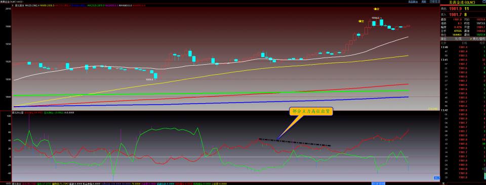 通过对黄金小时图解析得知,上周五白天时间段多头主力有拉高出货迹象,从下方的附图可以清楚地看到在横盘震荡期间形成了资金背离迹象,到了美盘时间段多头主力再次回复继续大量增仓动作一路增仓到目前为止,虽然今日早盘回落了接近20美金的空间但是我们可以清楚的看到多头主力持仓量已经再次创新高动作说明行情将会继续震荡上行上方继续关注1999和2010一线的阻力位即可,在操作上我们继续重点逢低做多思路不变,具体建议盘中通知