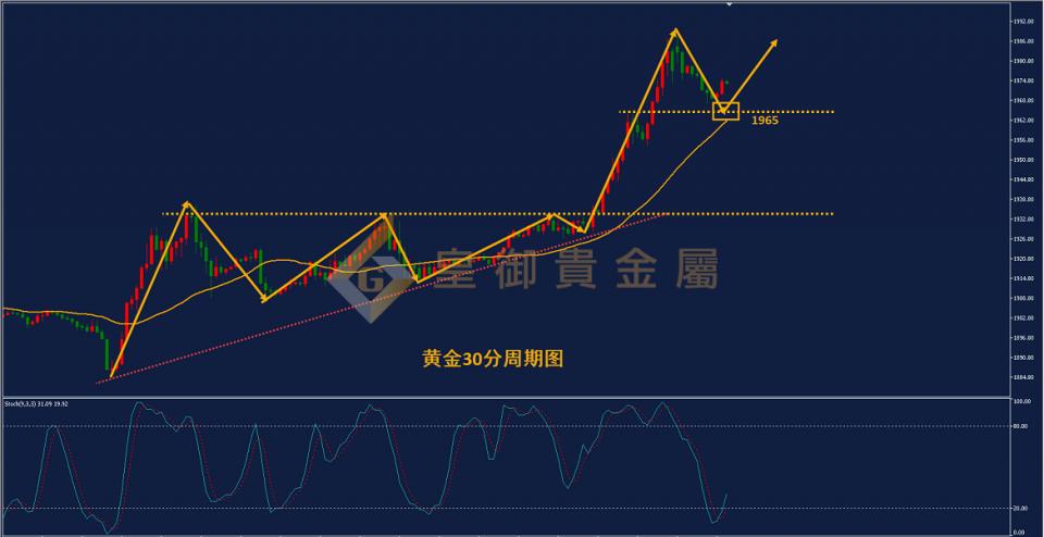 从下图的黄金30钟周期图来看,黄金突破三角形整理结构后单边上攻,期间在1965附近小作调整,最高上涨至1990附近。当前结构多头正盛,不宜轻易做空,更不必急着追多。目前Stoch技术指标回调至20下方,价格与均线偏离值较大,短线有一个修正的需求。投资者可以耐心等待回调,关注1965一带整理结构的水平支撑,此处也将与30日均线形成粘合共振,预计回调此处后反弹的概率较大。建议投资者尝试在此位置布局多单。
