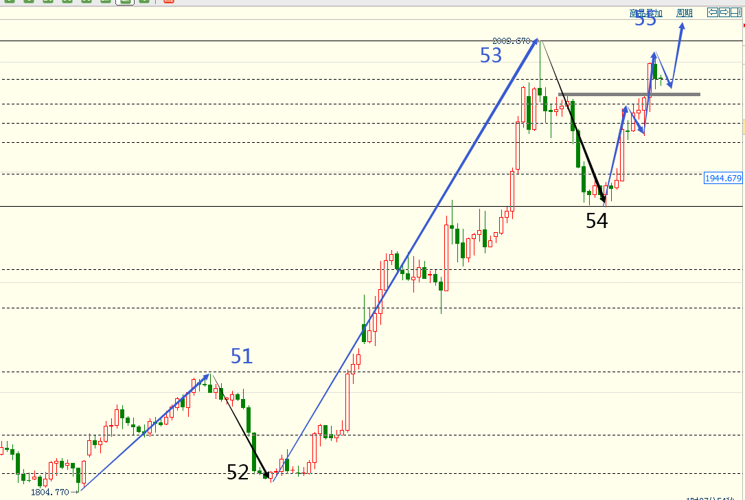 2、按照图灵波浪交易系统的更新,上破前高已经形成日线5浪推动走势,目前处于第5浪当中的次级别子浪5上涨中。万一反向跌破1968则宣告上涨结束。