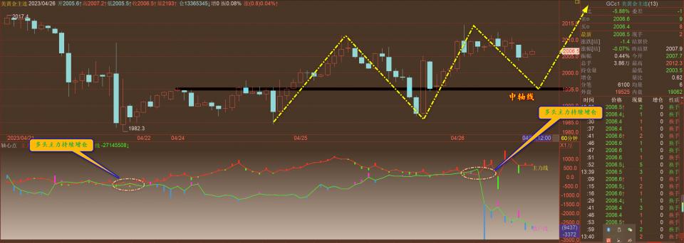 通过对黄金小时图解析得知,昨日行情继续延续宽幅震荡走势,从近期的几个交易日的走势来看整体的多头主力资金一直是处于不断增仓地动作,说明整体行情进一步突破的可能性比较大,下方附图可以清楚的看到多头主力在底板开始布局增仓介入从而导致行情一波的拉升,今日再次出现多头主力再次走强并且占优,空头主力大量出逃迹象已经造成两极分化,下方我们重点关注下方中轴线的强支撑(1984一线),在操作上我们继续重点逢低做多即可,具体建议盘中通知