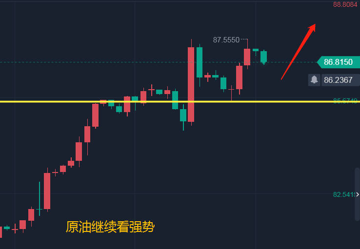 原油昨天整体走势还是很强,只是有一个回撤的动作有点意外,但只要方向对了就不怕路远,我们给出的86.7和86.1多单还是迎来反弹获利。日内原油的走势会很关键,不排除会形成双顶调整,但只要最后一次回踩的低点不破行情还是处于强势,也就是85.8上方继续看涨即可,而点位上关注86.7和86.2去多,损85.8,看88-89,如果继续反弹成功则可以看95!激进的可以87先轻仓多!