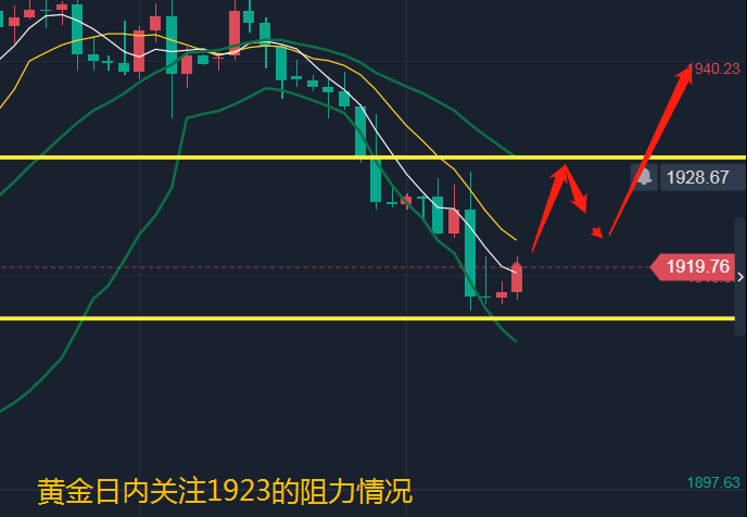 黄金昨天整体走势依然偏弱,亚欧盘震荡不破新高之后,美盘走出冲高回落形成一波大跌,黄金这一波的下跌调整力度还是很大的,基本上应该快要接近尾声了,今明两天会有变盘的可能,就算不变盘,行情也不在是一个单边的极弱走势,顶多震荡慢跌,但肯定是要先反弹。所以早间先看张再说,昨晚给出的1915多单可以继续持有看上方的压力1922,上破则可以看至1931附近,而日线的多空分水岭则是在MA10位置也就是1932附近,目前日线均线死叉,如果能上破1932并且站稳,后市则可以放心看涨。