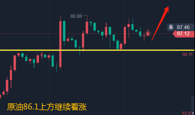 原油上周整体走势高位震荡,也可以说是一个区间波动88-86,只要卡好点位多空皆有利润,而我们也是一直保持低多思路对待,各种加仓各种盈利。震荡行情不能过分的看极强极弱,不然容易出现刀切豆腐两面光。周线上收取一根小阳,而均线也是多头排列,所以原油看涨是肯定的,但日内不好去判断强弱,一般周线收阳,早间是有回撤的,而早间确实低开,但力度稍显不足,所以对于现在的反弹是否有效不好确定,只能走一步看一步,而日线的强支撑则是86.1,日内不破油价会继续慢涨,下破我们就要调整思路看一波回落至83.5附近。所以原油87要么直接多,损86,看88-89.要么就观望等上破88之后再回落多!