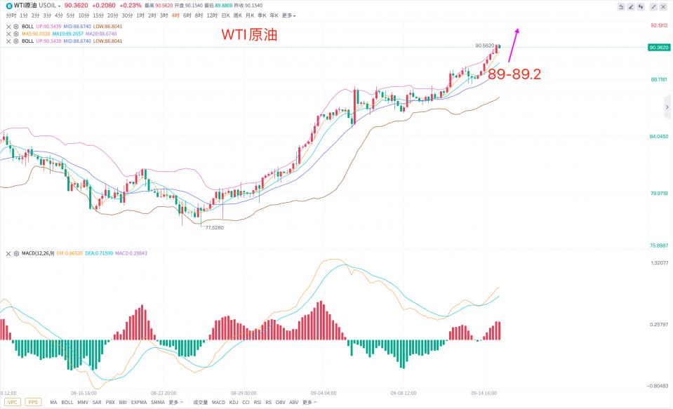 此外,我们可以看到原油价格在过去一个月表现出强劲的上涨势头。WTI原油价格昨天涨幅超过2%,这一上涨主要归因于沙特的减产计划。油价上涨不仅带动了大宗商品市场的整体上扬,而且也为我们提供了一个跟踪油价单边上涨的机会。原油还是以5日和10日均线为支撑位置进行跟进行情。 对于WTI原油的操作建议,我建议关注89.2至89.0的区域,并以此作为多单调整点位。我们将止损设在88.0,目标则定为90.5至90.8的区间。一旦价格突破这个目标范围,就会上移止损点,继续保持跟随油价的单边上涨行情。