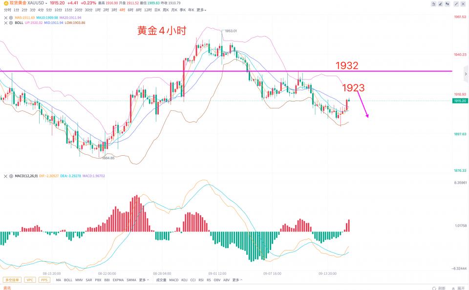 在昨天的交易中,伦敦金价再次下跌,从1910-1912美元/盎司的高点急剧下滑至接近1900美元。然而,美盘后在凌晨出现了强劲的反弹,使得今天早盘的金价重新回升至1916美元。尽管1900美元似乎具有强大的支撑力,但这波反弹是否意味着金价已经触底?我对此持怀疑态度。值得注意的是,美国8月份的消费者物价指数(CPI)同比增长了3.7%,这是连续第二个月反弹。高通胀无疑将迫使美联储加快加息进程。因此,不能排除金价进一步下跌的可能性。