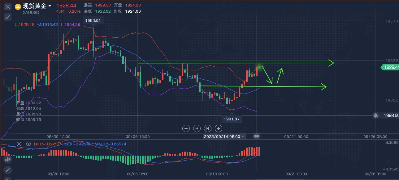 下方关键分水岭就是早盘地点1923,日内破低,一定就是震荡,再次破高的可能性就不大。但周五的大阳上升,同样会限制下跌幅度,下方关注1916附近,触及可以短多,