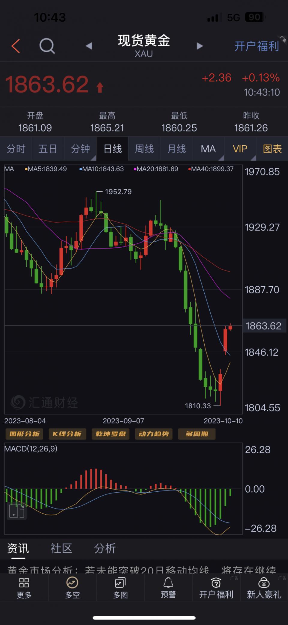 上午好,新的一天,新的开始了,黄金昨日跳空后一直处于1844-1855区间震荡,于凌晨企稳1855压力后,最高上行到1865一线,日线报收实体大阳线,站上短期5、10日均线上,但短线超卖严重,而周一高开的缺口还没回补,按照线形规律,行情肯定会回补的