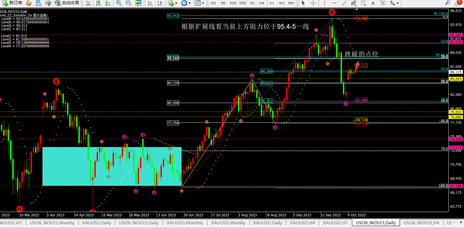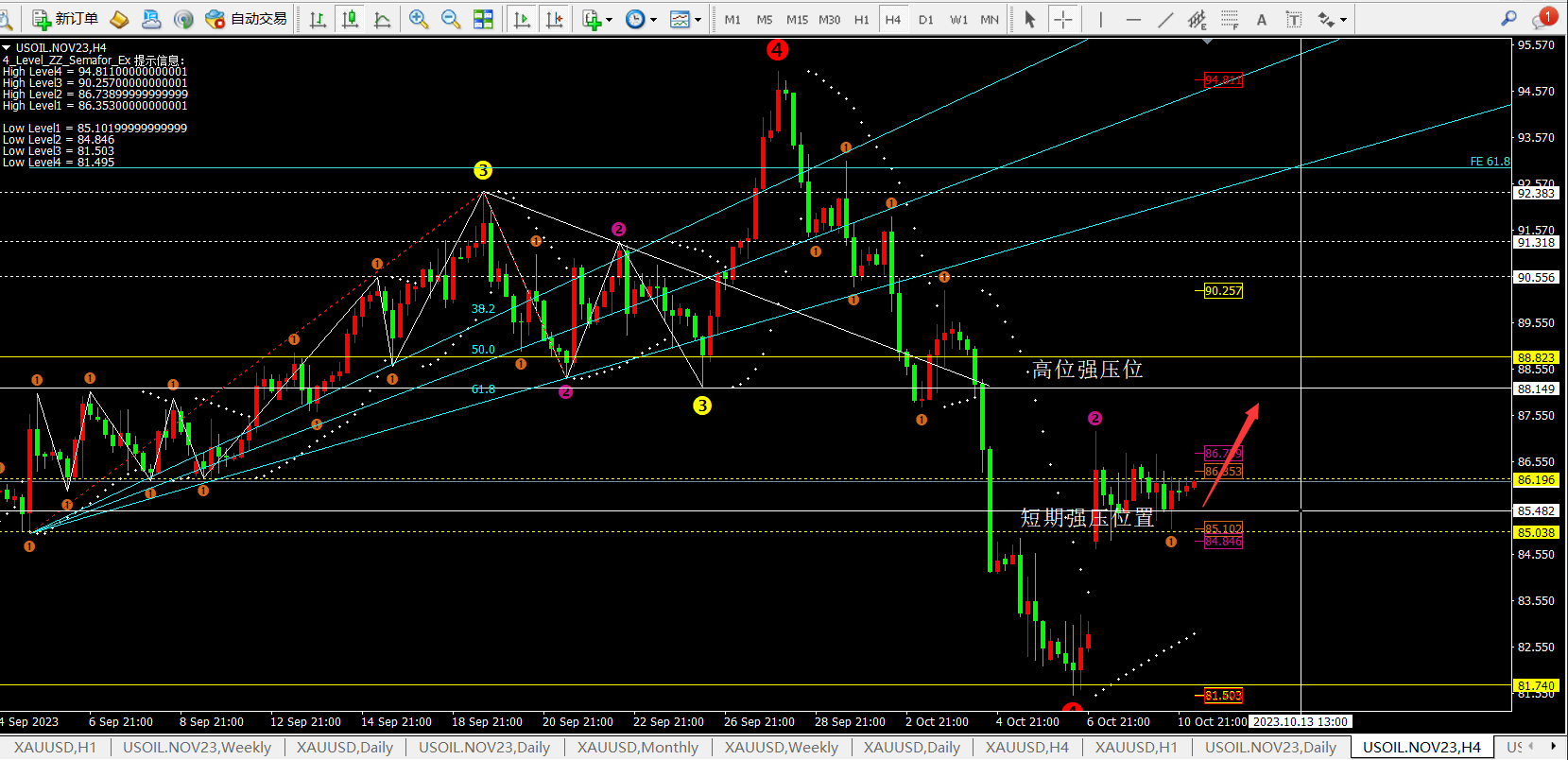 小时线目前属于震荡走势,短期关注中轨和下轨的支撑分别对应85.5以及85.9一线。稳妥起见我们在下轨附近参与多单。