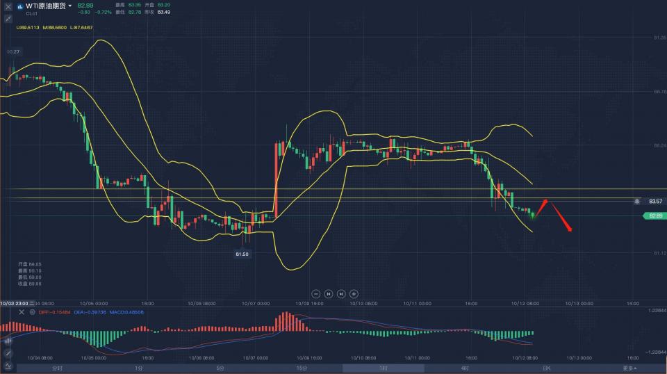 从日线上来看,布林带开口,价格连续阴线下跌,再度回到了近期的低点附近,整体来看,原油价格在经历了前段时间持续单边上涨之后,走出了深回调,形成了高位的宽幅震荡,昨天的回补缺口跌破了重要支撑,那么短线价格就有再度试探低点的可能。4小时,布林带收口,有走平迹象,价格跌破中轨支撑重回下轨附近,短线走势上偏弱,有打开下轨延续下行的迹象,日内短线关注上方83.7一线阻力。