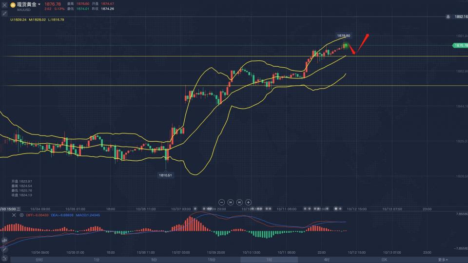 日线级别,布林带有收口走平迹象,价格按照预期反弹至布林中轨附近,在周二的文章中就说过,这波最起码是要反弹到1880一线的,当然这并不是这波反弹到头了,目前来看还未出现扭转迹象。4小时,布林带持续开口向上,价格在经历盘整后连续阳线震荡上行,日内短线关注的重点就是1880一线的破位情况,一旦突破,价格再度回到1900也不是没有可能,日内操作上还是以回调做多为主。