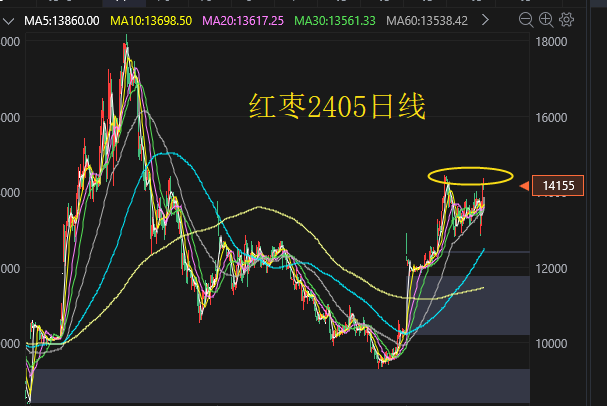 红枣2405,上周红枣下探后拉升,目前重点阻力区域,布局空头正当时;目前2405合约上周我们已经入场空单昨日14200上方完成补仓,接下来交给市场。
