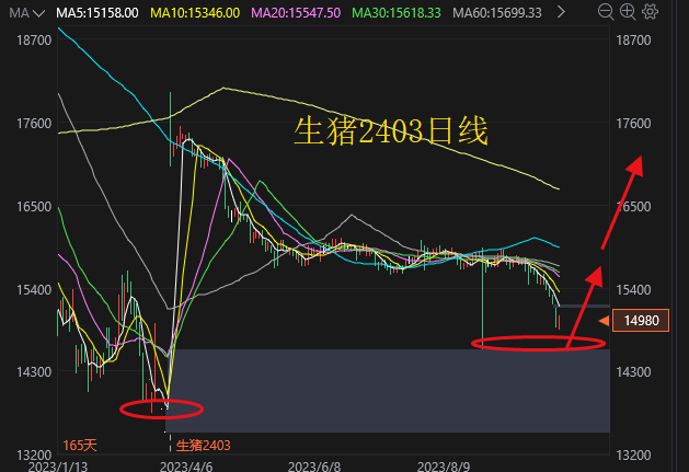 生猪,今年第一次关注生猪,以2403合约为例建议依托14700和13900为依托逢低布局中长线多单,向上看16500及18000和20000大关;国庆后一周我们在15000下方已经入场,随时等补仓。