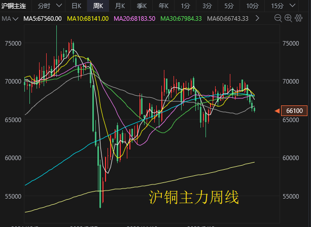 沪铜,目前周线来看,空头十分明显,高空为主。短线而言,跌势放缓,关注反弹。
