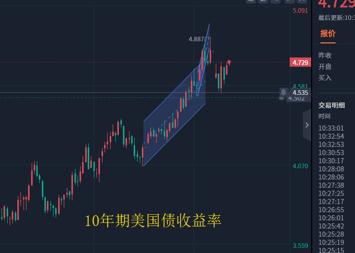 10年期美债收益率,4小时图4.88双顶后,下跌受4.5区域支撑迎来反弹;接下来继续关注双顶压力,依旧看好高位折腾后下跌。下方重点关注4.5区域中期支撑,下破则有望开启日线下跌,逐步跌向4.2及4.0或下方;下破前还有反复,以冲高下跌运行为主,参考以上制定策略。