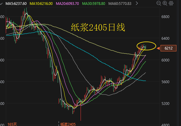 纸浆,今年初布局一次中长线多头,今年至目前为止纸浆迎来非常不错的上涨。上周我们指出纸浆多头呈现颓势,有望调整一波,并介入了空头;目前高位反复,关注空头机会,参考布局,预计400~800点利润空间;对应2405合约看至5800~5900及5400区域。
