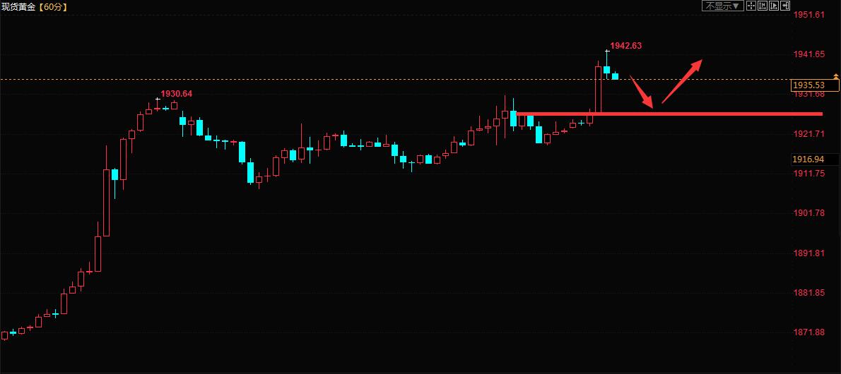 大家上午好,昨日黄金早间回落,午后探底回升,美盘震荡,截止到凌晨收盘,日线呈十字小阳。今日早间开盘黄金就来了一波拉升上涨,多头趋势明显,今天我们顺势看多,下方关注1928,1928是早间的起涨点,首次给到可多,目标1938。