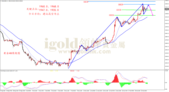 金价因巴以局势,避险情绪升温,走出连续性走出大涨,但是1小时周期中,已经开始出现较为明显的顶背离信号;结合从4小时周期图的形态上看,目前依然处于上涨通道内,但是布林带中轨的上涨倾斜率开始放缓,代表多头动能开始有放缓预期;从MACD动能上看,金价自上涨大涨以来,首次出现MACD顶背离现象,同时STO指标处于高位。日内继续关注新高突破情况,如果新高突破失败,则可以逢高布局空单。