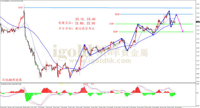 从1小时周期上看,昨天走出一根高位断头铡刀K线形态,暗示白银高位开始遇阻,并且MACD动能已经走出顶背离现象,上涨动能受阻明显。结合4小时周期图的形态上看,虽然目前的MA21和MA60依然处于多头排序阶段,但是上涨的幅度在明显缩短,布林带中轨的上涨倾斜率开始放缓,代表多头上涨开始进入乏力阶段。如果今天上涨再次出现受阻,不排除走出C浪调整;操作上建议高位遇阻布局空单为主。