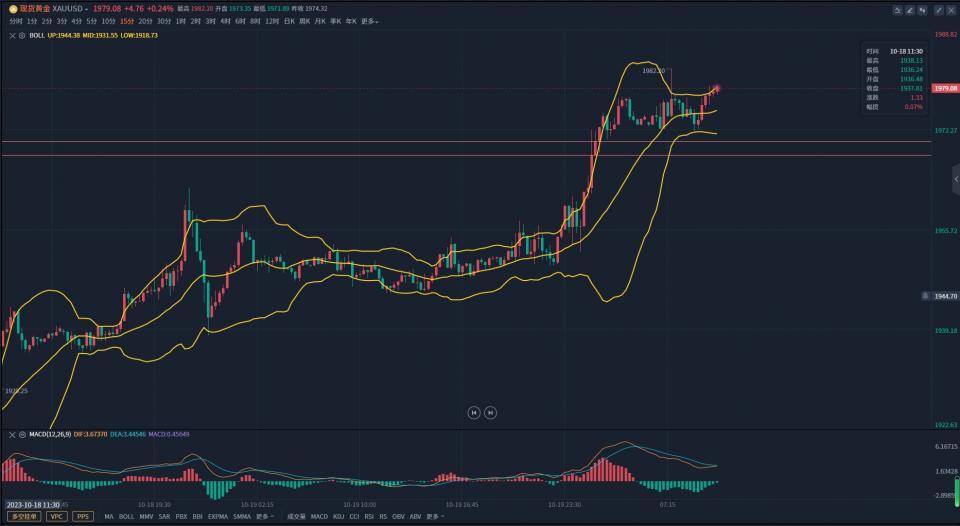 周四黄金再度发力,基本没有回调直接一路上行,近期的行情就是这样,当你想想等等回调的时候,可能就不给你上车的机会,每天早上的预判只能随着行情及时调整策略。一方面,美联储主席鲍威尔重申了利率必须在更长时间内保持较高水平的立场,缺乏对11月份利率的立即支持,美元下跌,黄金持续在高位震荡上行。另一方面,中东战争可能加剧、影响世界经济的风险也促使更多投资者转向避险资产,从而推动黄金上涨,短线2000美元不再是个梦。